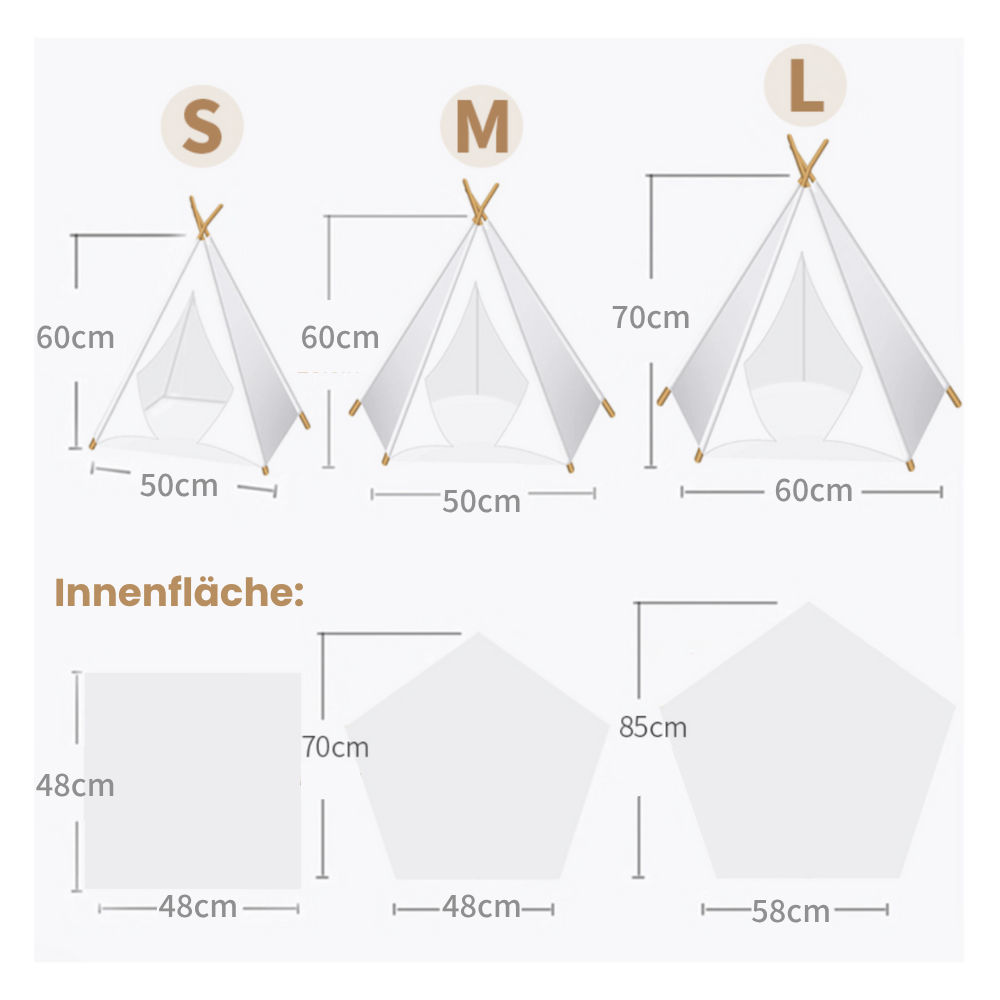 📐 Erhältlich in drei Größen (S, M, L), passt sich das Zelt ideal an Gewicht und Bedürfnisse deines Lieblings an – von der Mini-Katze bis zum kleinen Familienhund.